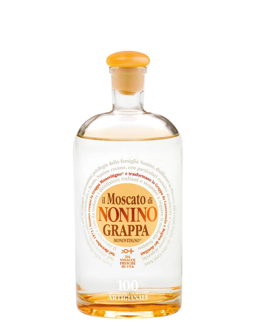 La Grappa Monovitigno Moscato di Nonino è ottenuta dalla distillazione di vinacce di Moscato raccolte nelle aree più vocate di produzione. La distillazione di tipo artigianale con metodo discontinuo in alambicco in rame e taglio della testa e coda di produzione, è seguita da invecchiamento di 24 mesi in barrique e piccole botti sotto il controllo e il sigillo dell’Agenzia delle Dogane e dei Monopoli.